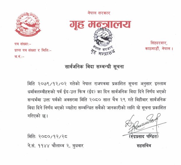 काठमाडौं । इस्लाम धर्मावलम्बीहरूको पर्व ईद–उल फित्र (ईद) को अवसरमा सरकारले भोलि बिहीवारका लागि सार्वजनिक बिदा दिएको छ । २०७९ सालको चैत २ गते राजपत्रमा प्रकाशित सूचनाअनुसार भोलि सार्वजनिक बिदा दिने निर्णय गरेको गृह मन्त्रालयले जनाएको छ । ईदको बिदा राजपत्रमै प्रकाशित भए पनि मिति भने हरेक वर्ष इस्लाम धर्मगुरुहरूले ईद मनाउने मिति तय गरेपछि मात्रै यकिन हुन्छ ।
