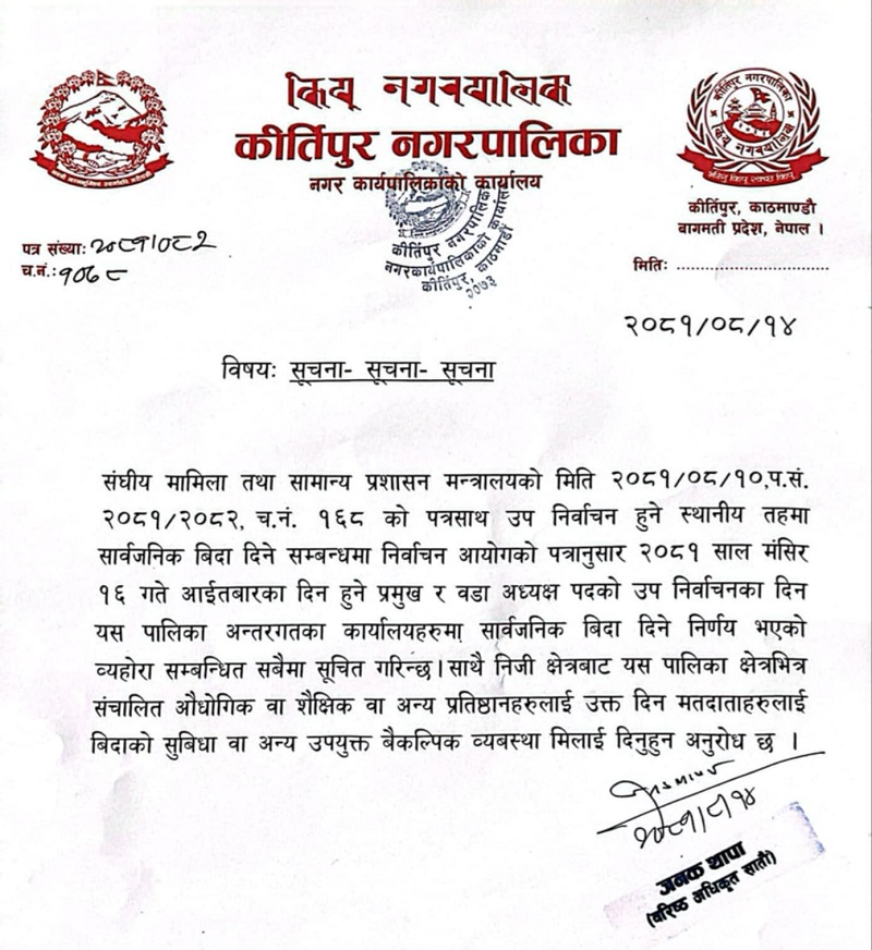 पालिका र वडाभित्र निजी क्षेत्रबाट सञ्चालित औद्योगिक, शैक्षिक वा अरु प्रतिष्ठानमा पनि बिदा दिन भनिएको छ । यसअघि निर्वाचन आयोगले पालिकाको उपचुनावका लागि सम्बन्धित पालिकाहरुमा सार्वजनिक बिदा दिन आग्रह गरेको थियो ।