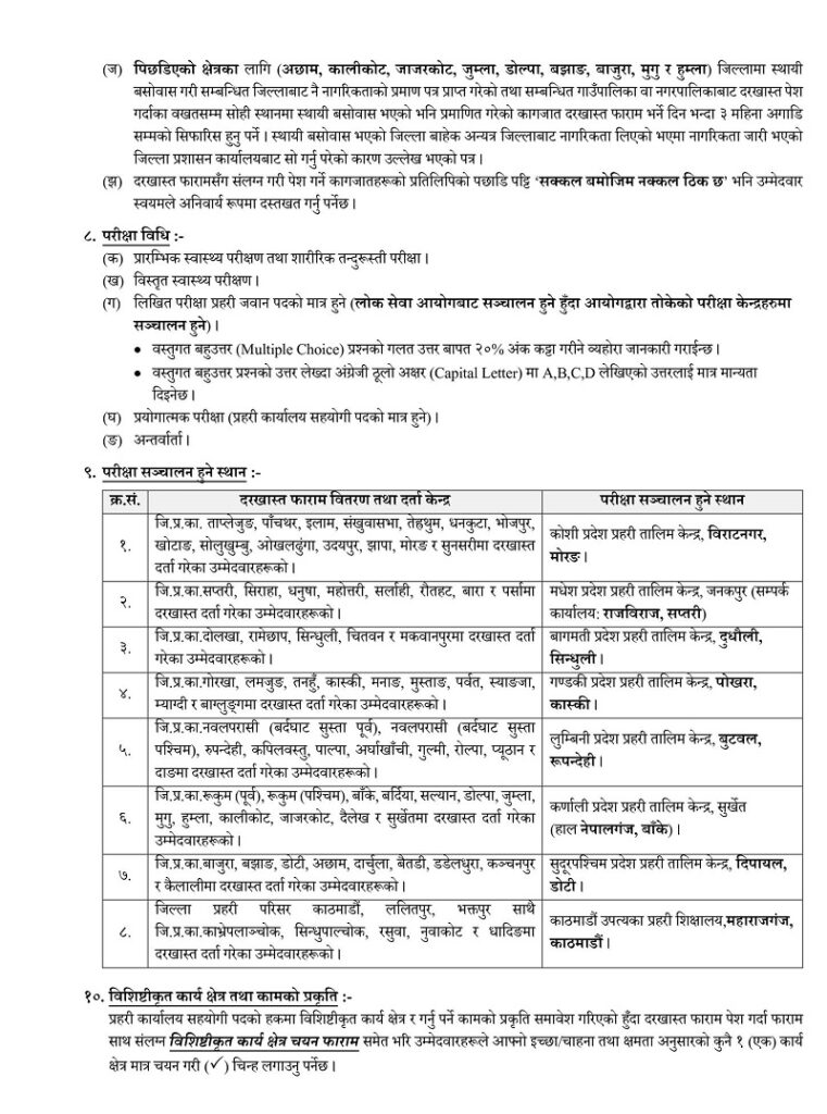 भर्ना छनौट शाखाका अनुसार कोशी प्रदेश प्रहरी तालिम केन्द्र विराटनगर, मधेस प्रदेश प्रहरी तालिम केन्द्र जनकपुर, बाग्मती प्रदेश प्रहरी तालिम केन्द्र दुधौली, गण्डकी प्रदेश तालिम केन्द्र पोखरा, लुम्बिनी प्रदेश तालिम केन्द्र बुटवल, कर्णाली प्रदेश तालिम केन्द्र बाँके, सुदूरपश्चिम तालिम केन्द्र दियायलका साथै काठमाडौं, भक्तपुर, ललितपुर जिल्ला प्रहरी परिसर र सबै जिल्ला प्रहरी कार्यायलबाट फारम भर्ने व्यवस्था मिलाइएको छ । यही मङ्सिर २७ गतदेखि माघ ७ गतेसम्म फारम भर्न सकिने सूचनामा उल्लेख छ ।